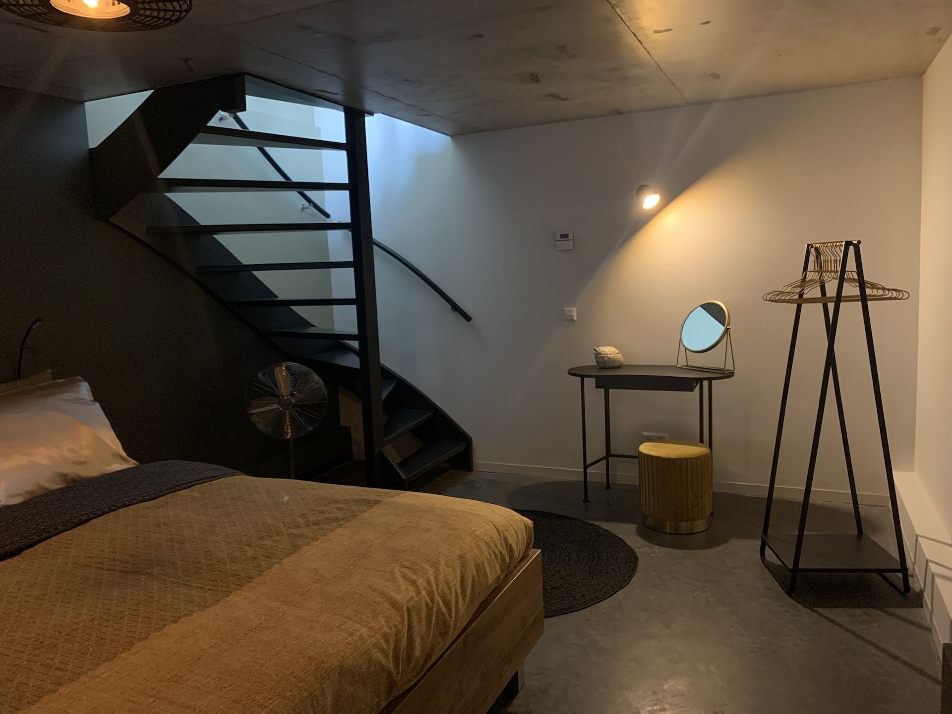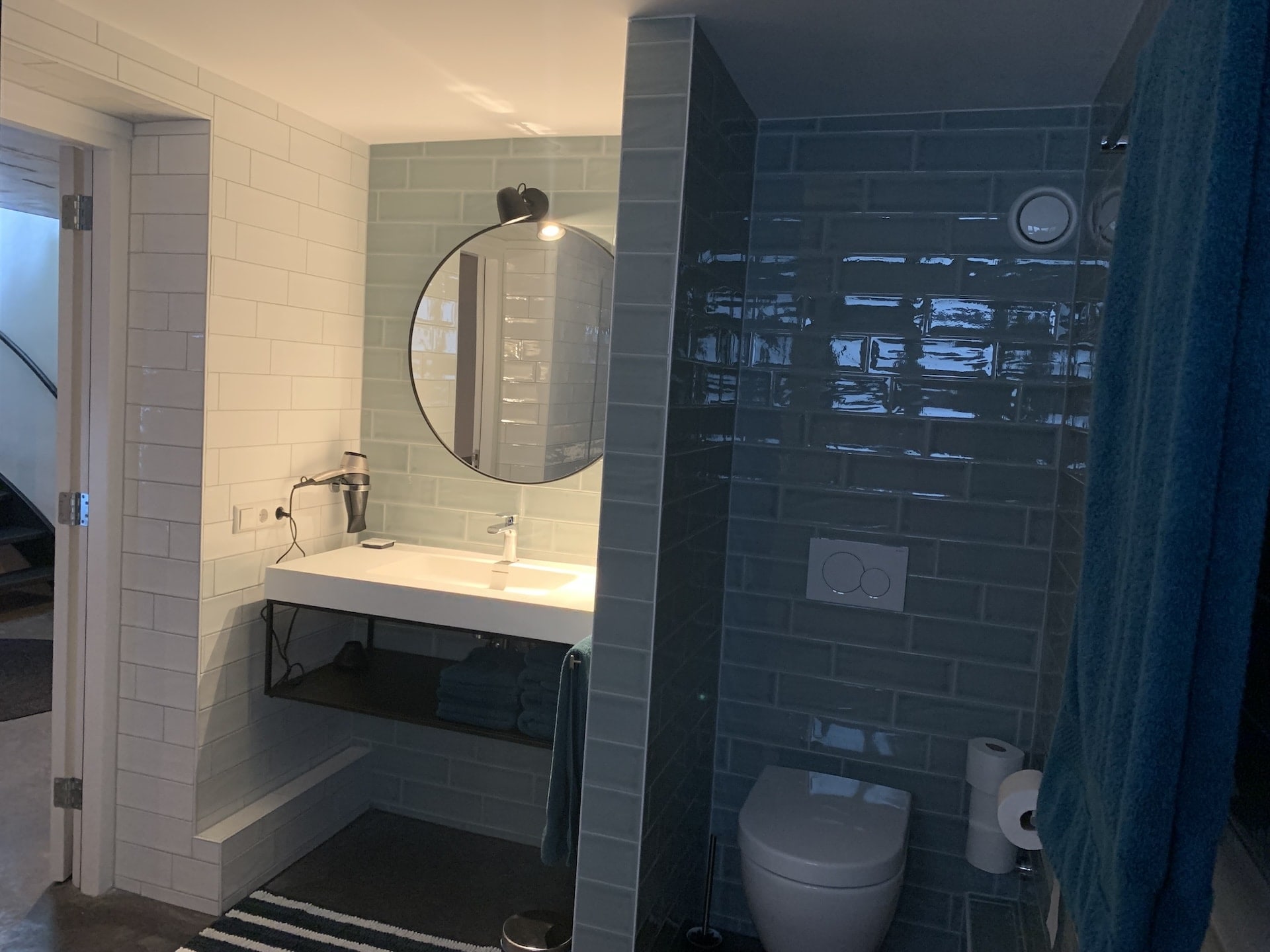 De slaapkamer en badkamer bevinden zich in de kelder. Kleine ramen zorgen voor daglicht. Samen met de ruime indeling merkt u bijna niet dat u zich in de kelder bevindt. Het grote voordeel is dat de slaapkamer ook op warme zomerdagen heerlijk koel blijft. Het bed is 180 cm breed en heeft een 2-persoonsdekbed. Goed om te weten: er zijn geen aparte dekbedden. In de badkamer is een ruime inloopdouche met regendouche, een brede wastafel en toilet.